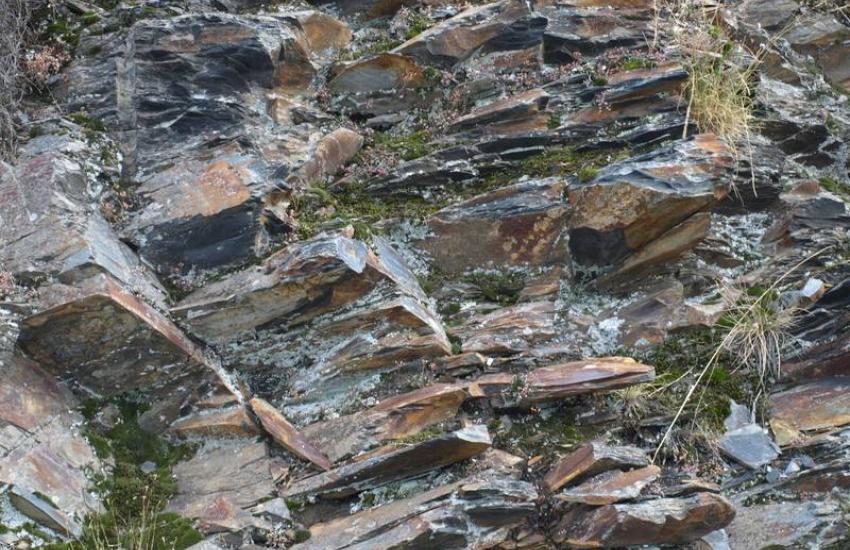 Las pizarras encajantes presentan una intensa alteración hidrotermal con silicificación, moscovitización y piritización generalizada.